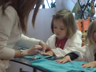 For the girls 4th birthday, we went to the Nutcracker with basically our entire extended family. Well, one day the girls asked when they would see their little friends. So with a generous gift from Margaret and Bruce, we had our nails done on the Friday before their birthday. Ellison was sweet enough to be our guest. C & J were very excited and Ellison appeared to be as well.